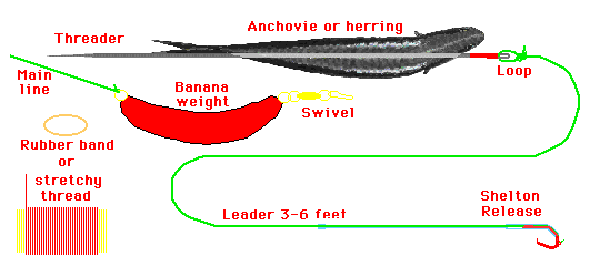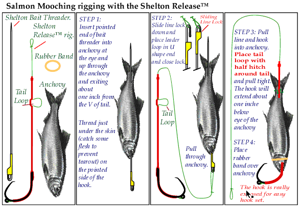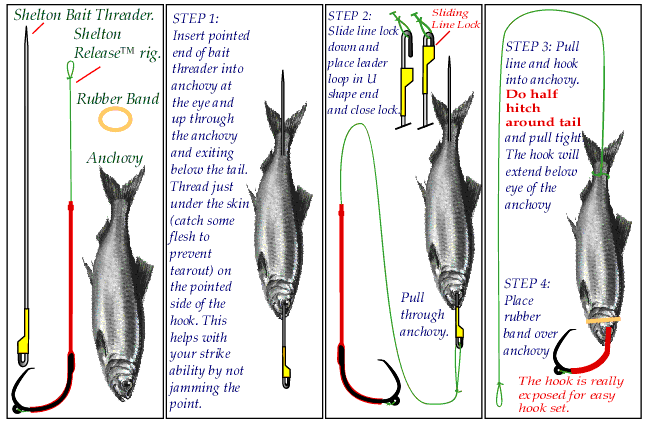 Rigging up by using a bait threader. Thread anchovie or herring going in at the eye and coming out 1/2 inch below V part of tail. Hook the loop on the end of the leader with the bait threader and pull line through bait. On short sleeve, then just to a half hitch with the top of sleeve just at the half hitch. On long sleeve pull sleeve up for enough until the tail loop shows. Take tip of bait threader and use it to pick up the tail loop where it comes out the sleeve and pull line out and do a half hitch with the tail loop adjusted to where it comes out the anchovie. Rig a tiny rubber band over gills or wrap gill with stretchy thread to prevent gills from flaring when pulling the bait backwards. The ways to rig are endless, use your imagination. Rig with bait head up or down. Use cut plug rigged your favorite way. The hook sleeve is hidden with only the tip sticking out on the short sleeve rig. On the long sleeve rig the top of the sleeve extend an additional inch up line for more line chafing protection.