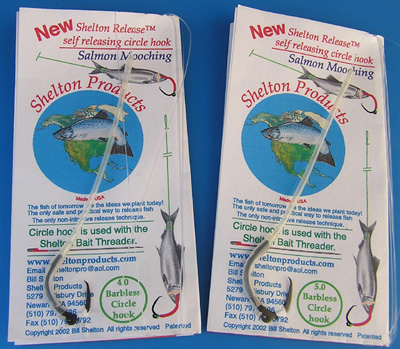 Shelton Release self releasing circle hooks for salmon. The Shelton Release has a sleeve that holds the hook in the straight position while fishing. After the angler catches the salmon, the hook is removed by pulling the sleeve forward either by hand or trip rod. When the sleeve clears the shank of the hook, the hook is rotated at the eye located at the bottom of the hook by pulling on the main line. When the hook has rotated it will self releases.The ease of releasing will help prevent excessive handling in removing hook. Super strong by design and has a built in line protector.