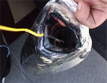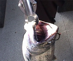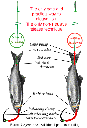 Shelton Release self releasing J hook (long sleeve). This show the releasing technique for larger species fish such as stripers, white seabass, catfish, sturgeon and large toothy species. |
