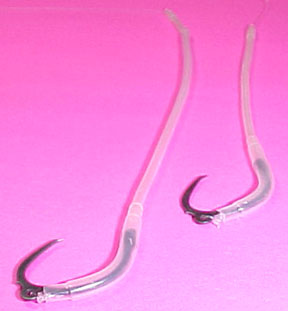 Shelton Release self releasing circle hooks. This is how they are packaged. The retail price is $4.00 per packaged rig. The long sleeve offers more chafing protecting for the line. The short sleeve is easier to use. They are tied with Carbello's 100% florocarbon line in 20 # test. |
